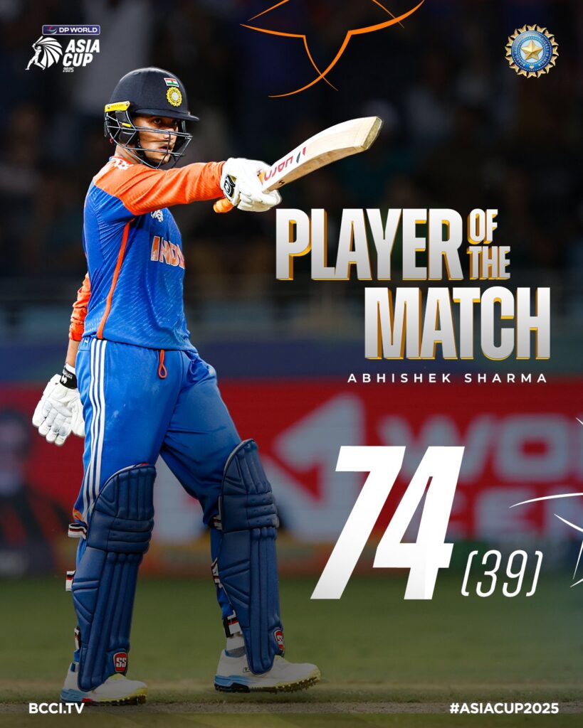 भारत के लिए अभिषेक शर्मा ने 74 रन बनाए। शुभमन गिल ने 47 रन बनाए। तिलक वर्मा 30 रन बनाकर नाबाद रहे। संजू सैमसन 13 रन बनाकर आउट हुए। हार्दिक पंड्या 7 रन बनाकर नाबाद रहे। सूर्यकुमार यादव बगैर खाता खोले आउट हुए। पाकिस्तान के लिए हारिस रऊफ ने 2 विकेट लिए। अबरार अहमद और फहीम अशरफ ने 1-1 विकेट लिए।