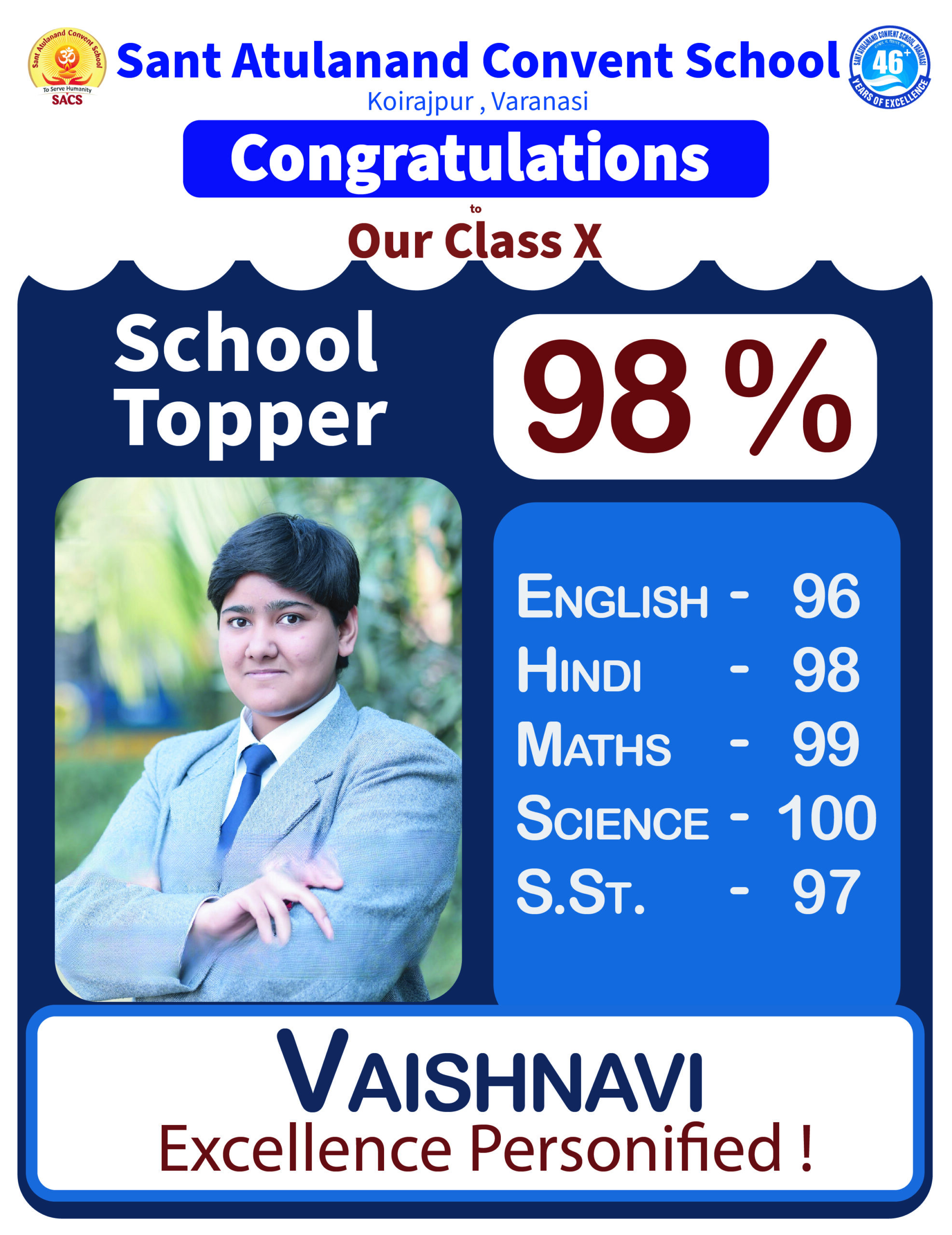 वाराणसी। CBSE कक्षा 10वीं के घोषित परीक्षा परिणाम में संत अतुलानंद कॉन्वेंट स्कूल, कोइरजपुर के विद्यार्थियों ने उत्कृष्ट सफलता हासिल करते हुए एक बार फिर अपनी शैक्षणिक गुणवत्ता का परिचय दिया है। इस वर्ष कक्षा 10वीं की छात्रा वैष्णवी ने 98 प्रतिशत अंक प्राप्त कर विद्यालय में प्रथम स्थान हासिल किया और सभी के लिए प्रेरणा बन गईं