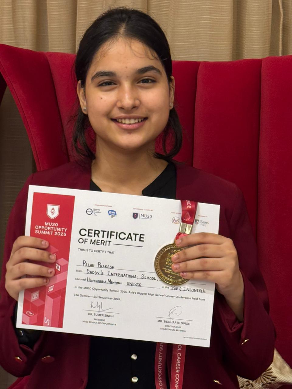 Daddy’s International School की छात्रा Palak Prakash को मिला अंतरराष्ट्रीय सम्मान