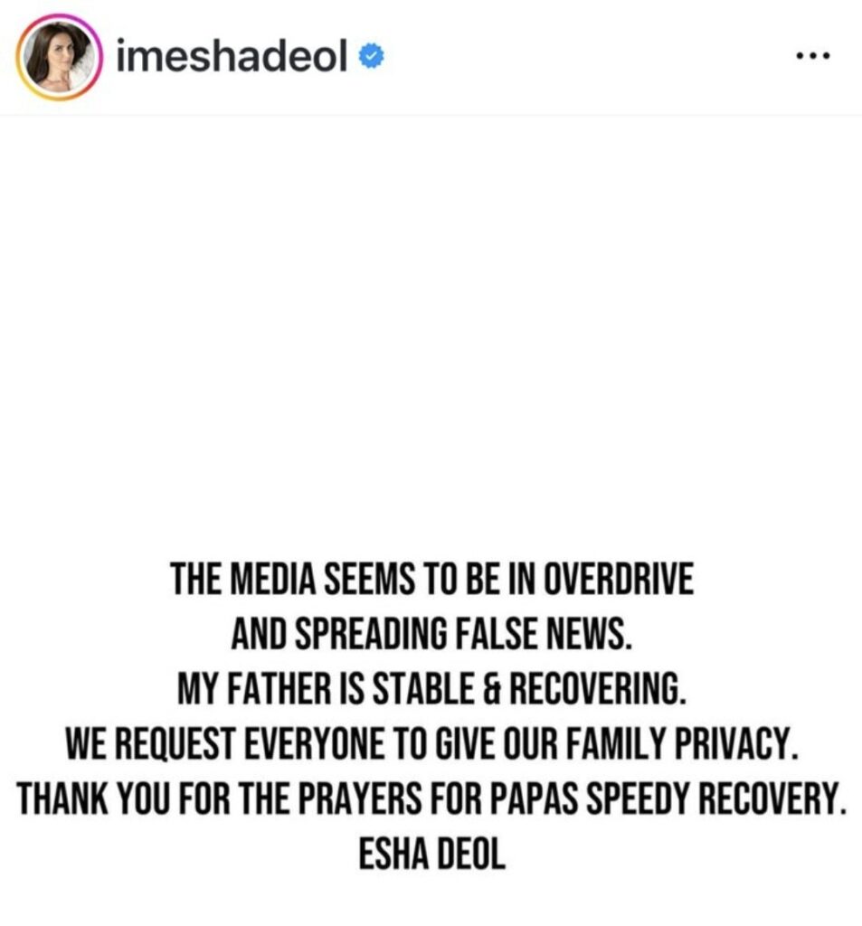 ईशा देओल ने ट्वीट किया कि मंगलवार सुबह कई मीडिया वेबसाइट और चैनलों ने पिता की मौत की झूठी खबर फैलाई। हेमा मालिनी ने भी मीडिया पर गुस्सा जाहिर करते हुए कहा, “जिम्मेदार चैनल एक ऐसे व्यक्ति के बारे में झूठी खबर कैसे फैला सकते हैं जो इलाज के असर से ठीक हो रहा है। यह बेहद अपमानजनक और गैरजिम्मेदाराना है। कृपया परिवार और उनकी निजता का सम्मान करें।”