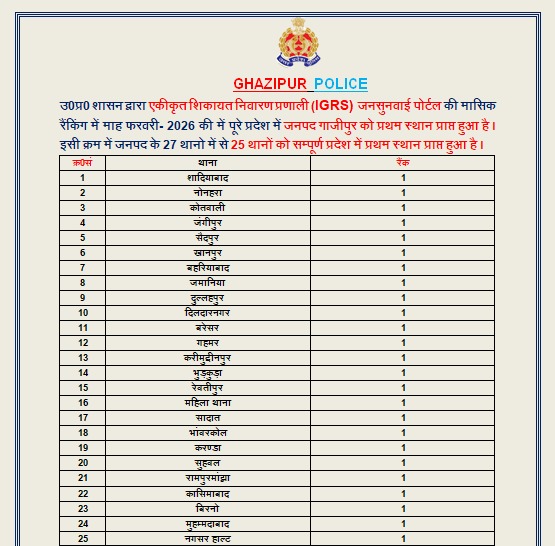 गाजीपुर (जयदेश)। उत्तर प्रदेश सरकार की ऑनलाइन शिकायत प्रणाली जनसुनवाई पोर्टल (आईजीआरएस) के माध्यम से प्राप्त शिकायतों के समयबद्ध और गुणवत्तापूर्ण निस्तारण में गाजीपुर पुलिस ने प्रदेश में पहला स्थान प्राप्त किया है। विगत माह फरवरी की रैंकिंग में जनपद गाजीपुर को यह उपलब्धि मिली है। इसके साथ ही जिले के 27 थानों में से 25 थानों को भी प्रदेश स्तर पर प्रथम स्थान प्राप्त हुआ है।