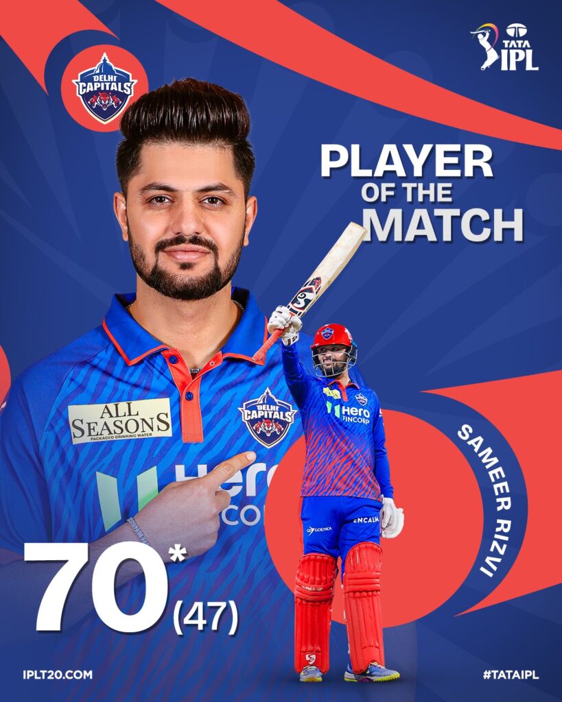 दिल्ली कैपिटल्स ने 18वें ओवर की पहली ही गेंद पर 4 विकेट खोकर 142 रन बनाते हुए लक्ष्य हासिल कर लिया और मुकाबला 6 विकेट से अपने नाम कर लिया। इस तरह समीर रिजवी की नाबाद अर्धशतकीय पारी दिल्ली की जीत की सबसे बड़ी वजह बनी।