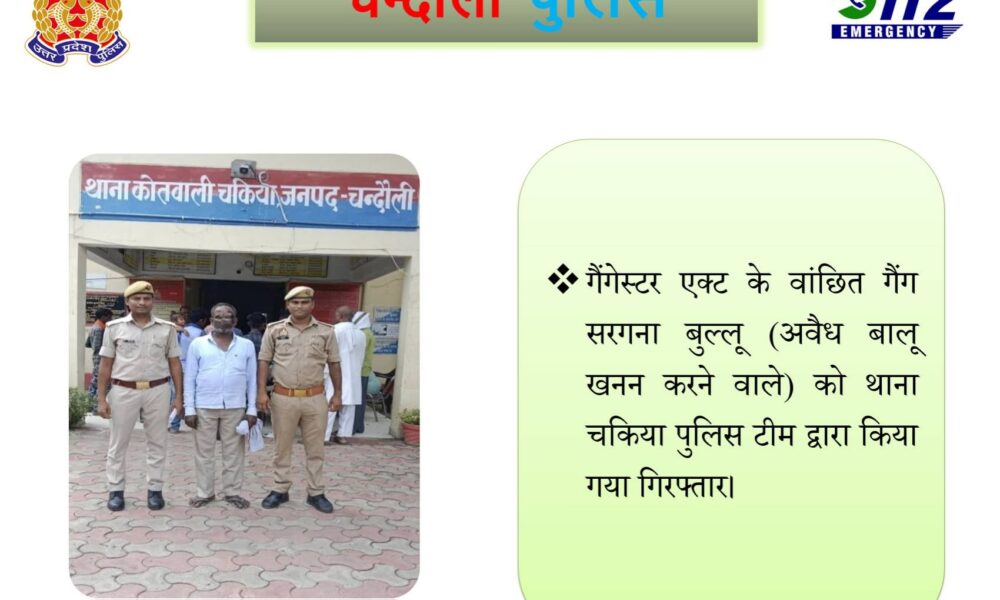चंदौली (चकिया)। कोतवाली पुलिस ने गैंगस्टर एक्ट के वांछित अभियुक्त बल्लू पुत्र रामअधार को मोहम्मदाबाद पुल के पास से मुखबिर की सूचना पर मंगलवार की सुबह...