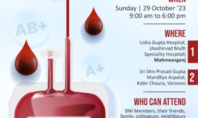 वाराणासी। BNI वाराणसी अपने छठे स्थापना दिवस के उपलक्ष्य में दिनांक 29 अक्टूबर रविवार को अनुकरणीय व अनमोल कार्य रक्तदान महाकुंभ शिविर का आयोजन सुबह 9...