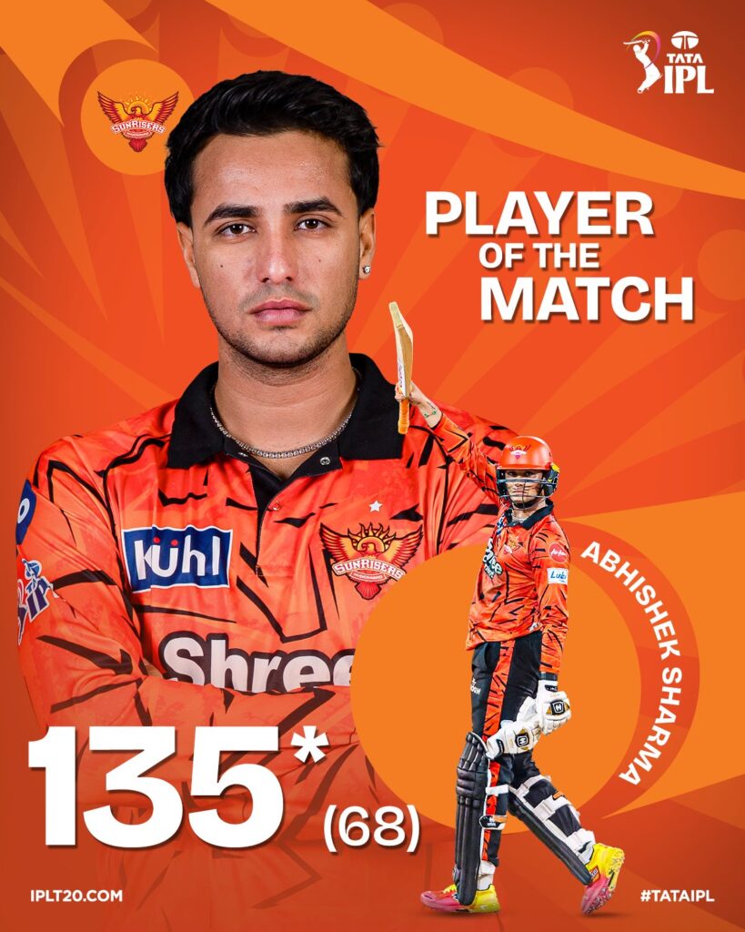 इससे पहले टॉस हारकर बल्लेबाजी करने उतरी सनराइजर्स हैदराबाद (Sunrisers Hyderabad) की टीम को अभिषेक शर्मा ने आक्रामक शुरुआत दिलाई। उन्होंने 68 गेंदों में नाबाद 135 रन की पारी खेली, जिसमें 10 चौके और 10 छक्के शामिल रहे। ट्रैविस हेड ने 26 गेंदों में 37 रन बनाए और दोनों के बीच पहले विकेट के लिए 97 रन की साझेदारी हुई। इसके बाद अभिषेक ने कप्तान ईशान किशन के साथ 79 रन जोड़े, जिन्होंने 13 गेंदों में 25 रन बनाए। अंत में हेनरिक क्लासेन ने 13 गेंदों में नाबाद 37 रन बनाकर टीम को 242 के विशाल स्कोर तक पहुंचाया।