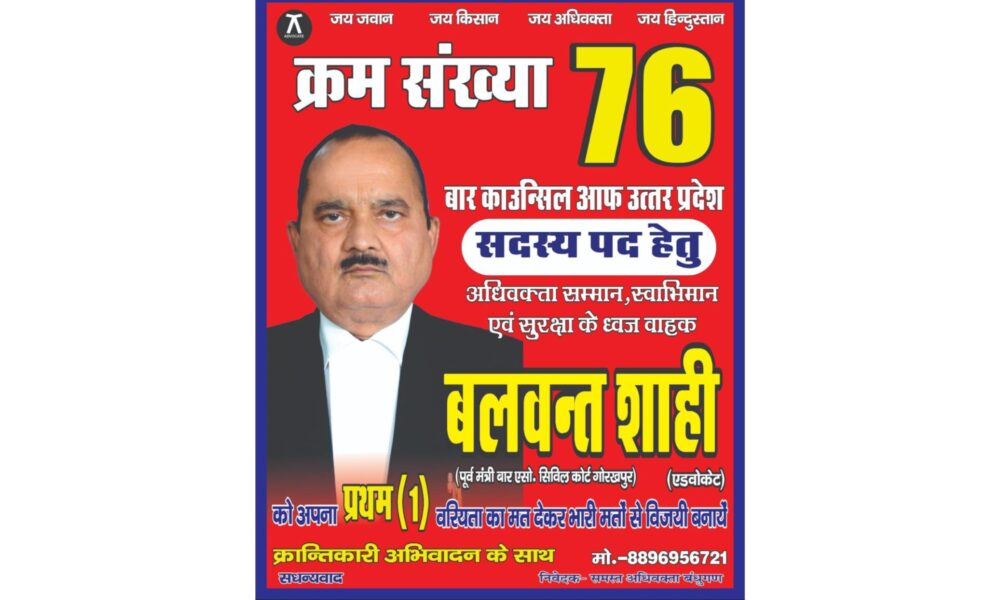गोरखपुर बार काउंसिल सदस्य पद के क्रमांक संख्या 76 के उम्मीदवार बलवंत शाही इन दिनों पूरे मंडल और आसपास के जिलों में अधिवक्ताओं से लगातार संपर्क...