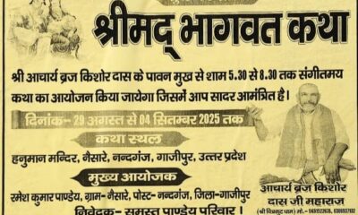 नन्दगंज (गाजीपुर)। नैसारा गांव स्थित हनुमान मंदिर प्रांगण में 29 अगस्त से 04 सितम्बर तक संगीतमय श्रीमद् भागवत कथा का भव्य आयोजन किया गया है। श्रीमद्...