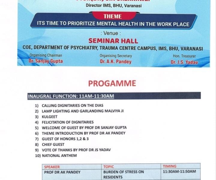 वाराणसी। मानसिक स्वास्थ्य दिवस के अवसर पर 10 अक्टूबर को पूर्वाह्न 11 बजे आईएमएस बीएचयू द्वारा ट्रामा सेंटर परिसर में कार्यक्रम आयोजित किया गया है जिसमे...